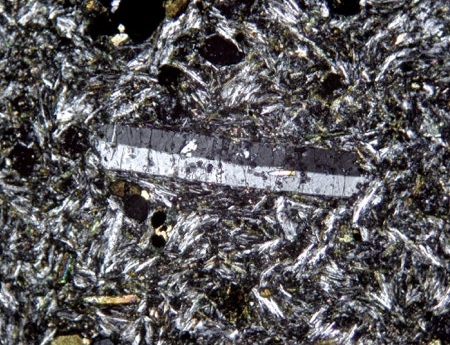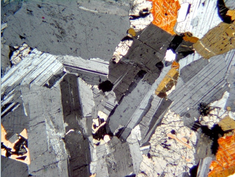 Vista de dos tipos de maclas en secciones delgadas obervadas con nícoles o polarizadores cruzados. Izquierda: macla polisitética en cristales de plagioclasa, Derecha: Macla de Carlsbad en cristal de plagioclasa. Fuente: Sitio web de Atlas de Mineralogía Óptica, P. Gil-Crespo, Ver sitio